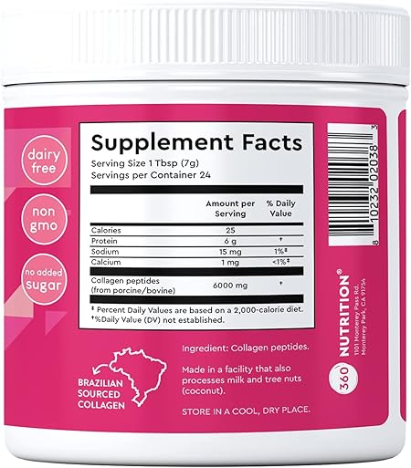 360 Nutrition Pure Collagen 6000 MG Drink Mix Powder unflavored 6 oz 24 Servings FULL-SPECTRUM NUTRITION 6000 mg collagen and 20 amino acids per serving.